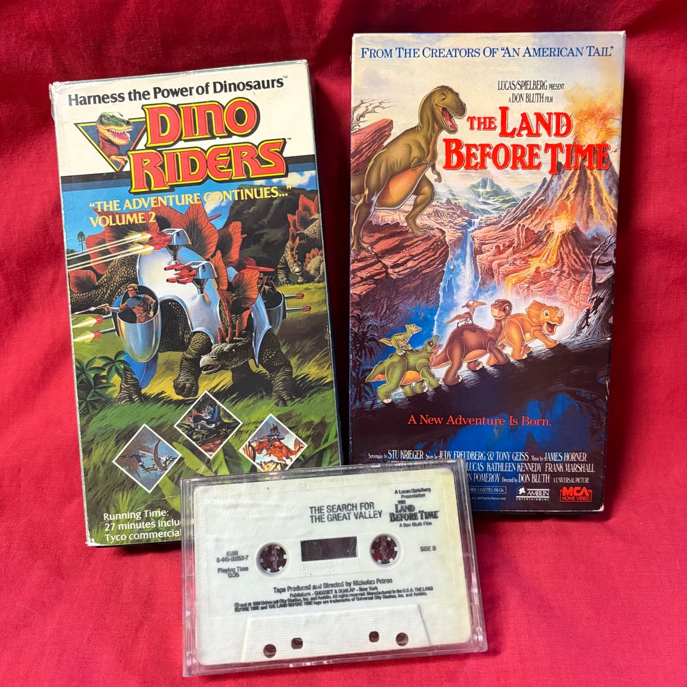 I sure loved dinosaurs as a kid. Here’s a clutch of dino related vhs tapes and a land before time story cassette. Retro.